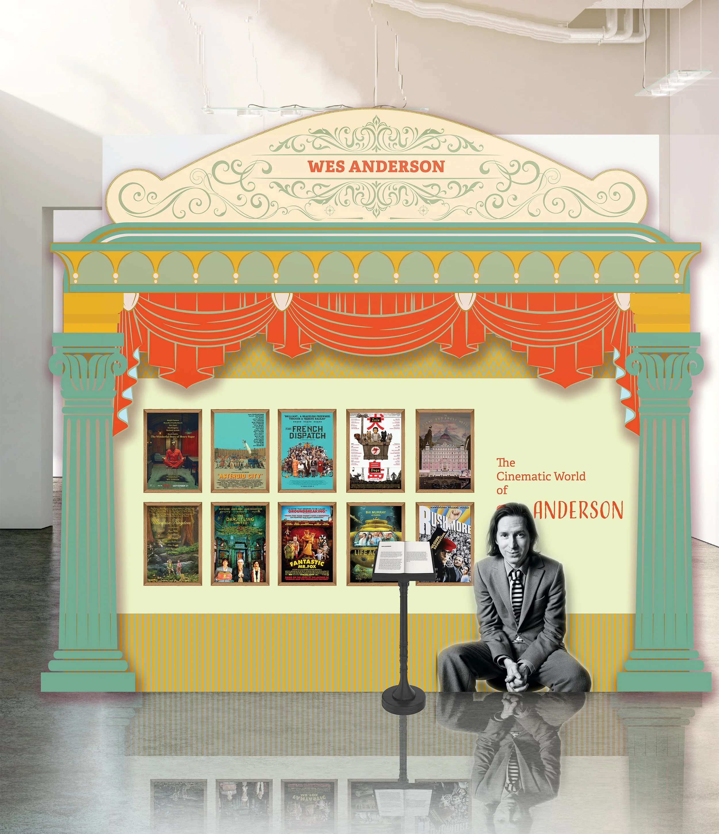 The Intro Wall sets the tone with three distinct layers: a black-and-white front layer featuring Wes Anderson and a book stand, symbolizing his use of monochrome to depict reality. The middle layer showcases a theatrical arch adorned with Roman columns and curtains, evoking classic cinema grandeur. The background layer completes the scene with a vintage wall pattern and film posters arranged to resemble an old-fashioned theater lobby.
