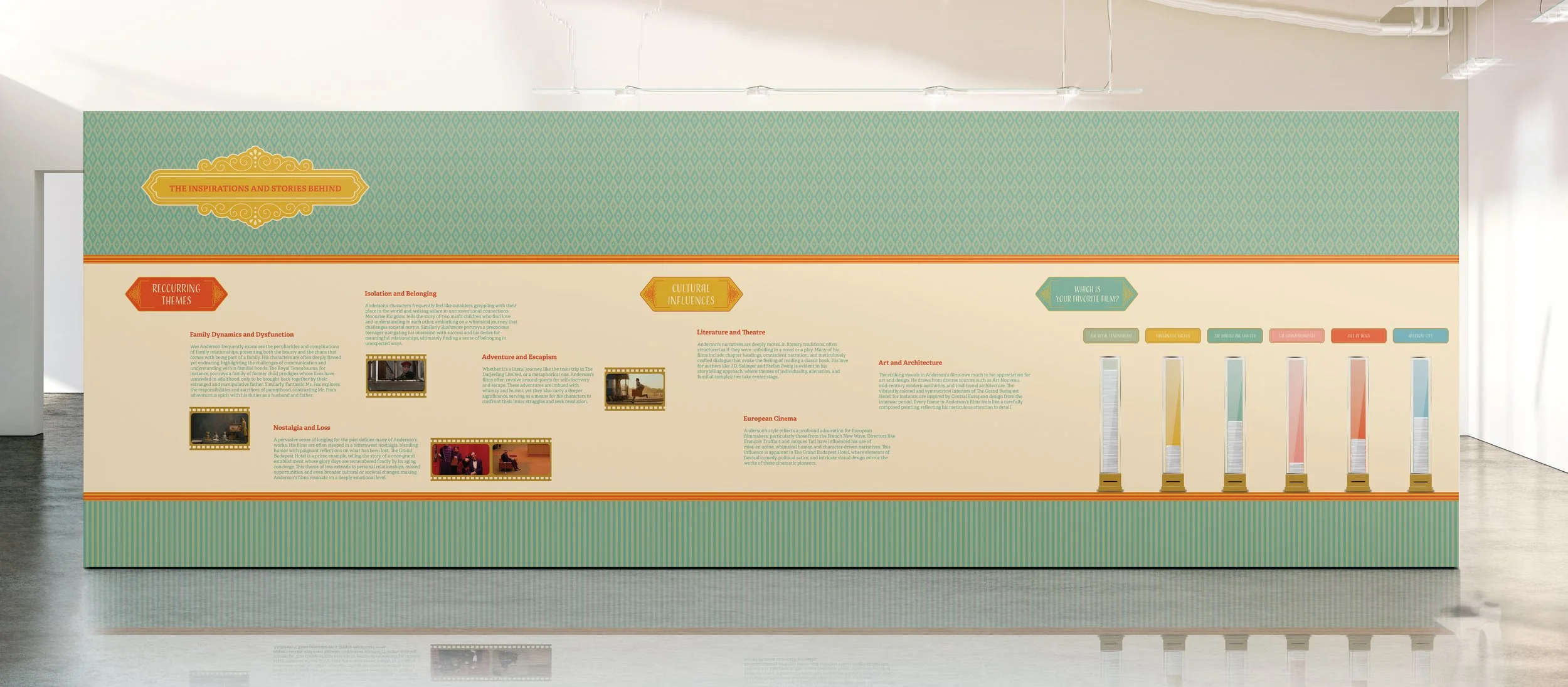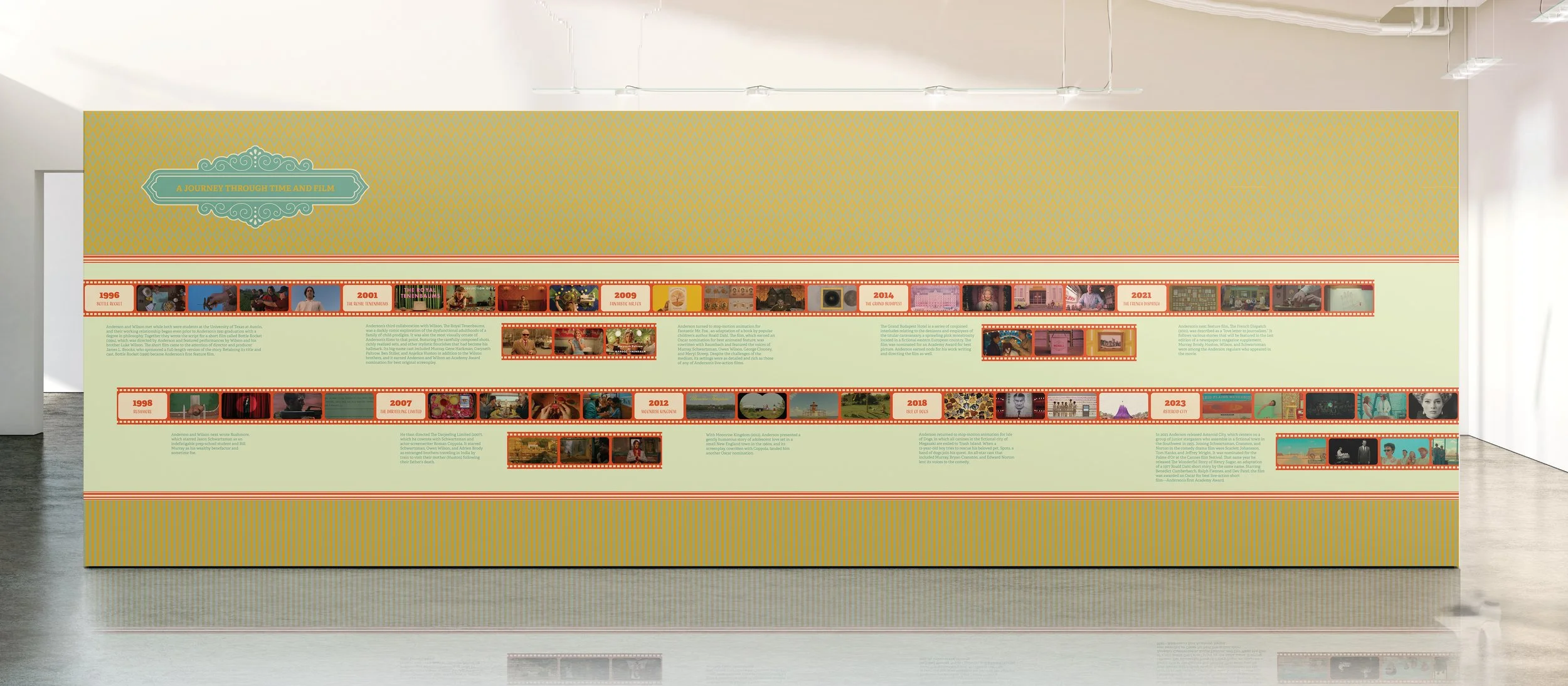 The Timeline Panel continues this cohesive design, using the same vintage wall pattern as the intro wall’s background. Here, Wes Anderson’s filmography unfolds through a film strip timeline, guiding visitors through his cinematic journey with a sense of narrative flow and visual continuity.